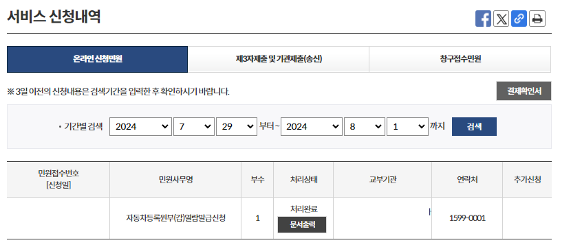 - 발급이 완료되면 아래와 같이 서비스 신청내역에서 출력(열람)이 가능합니다.